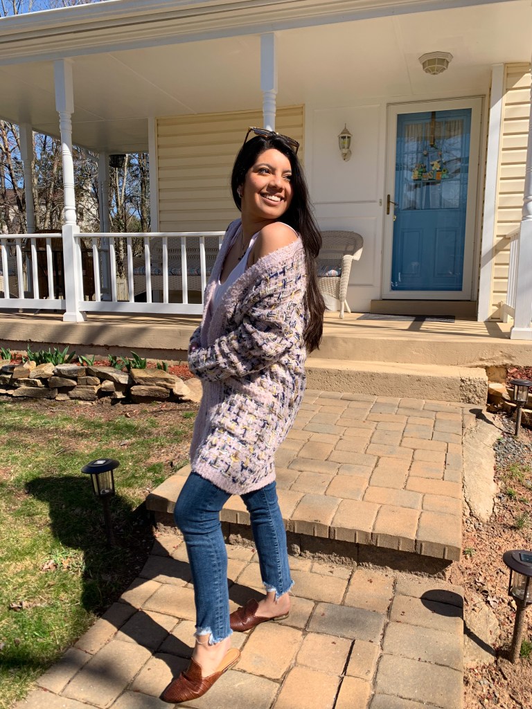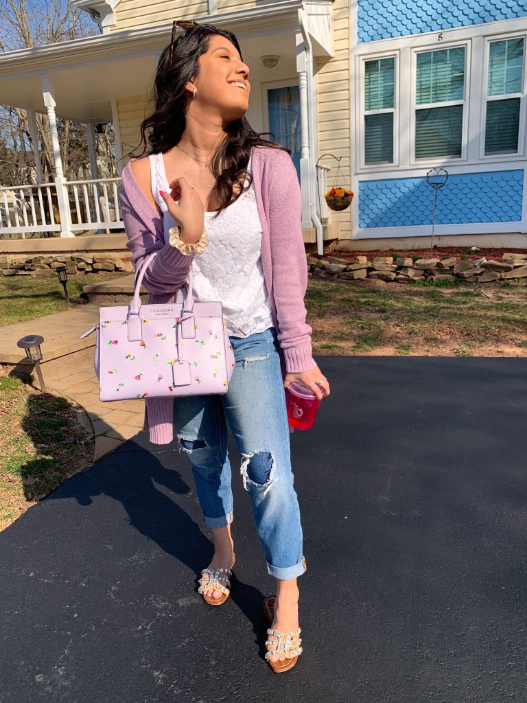 As I mentioned earlier, I like to have a few different styles and colours of each item so that I can regularly interchange them and make a whole new outfit but still fit the same basic concept. Plug and play, as I like to call it. 🛍For example, right now I have 3 main cardigans that I can cycle through for this time period, the lilac one shown in these pictures, a green one, and a tan one so that there is a neutral colour as well as pops of colours to add to the outfit. Similarly, as I mentioned I have the nude sparkly sandals I wore in these pictures as well as a light pink pair and I also usually wear a pair of cheetah cloth wrap sandals to slip on and off. Neutrals, a pattern, and a colour are all within my rotation of sandals. I hope this helps frame a picture for you to create your own spring uniform or tailor yours after mine! Please let me know in the comments or DM me on Instagram @saraeliseblog to tell me about your spring uniform or if you have any questions or need advice on creating a look of your own.