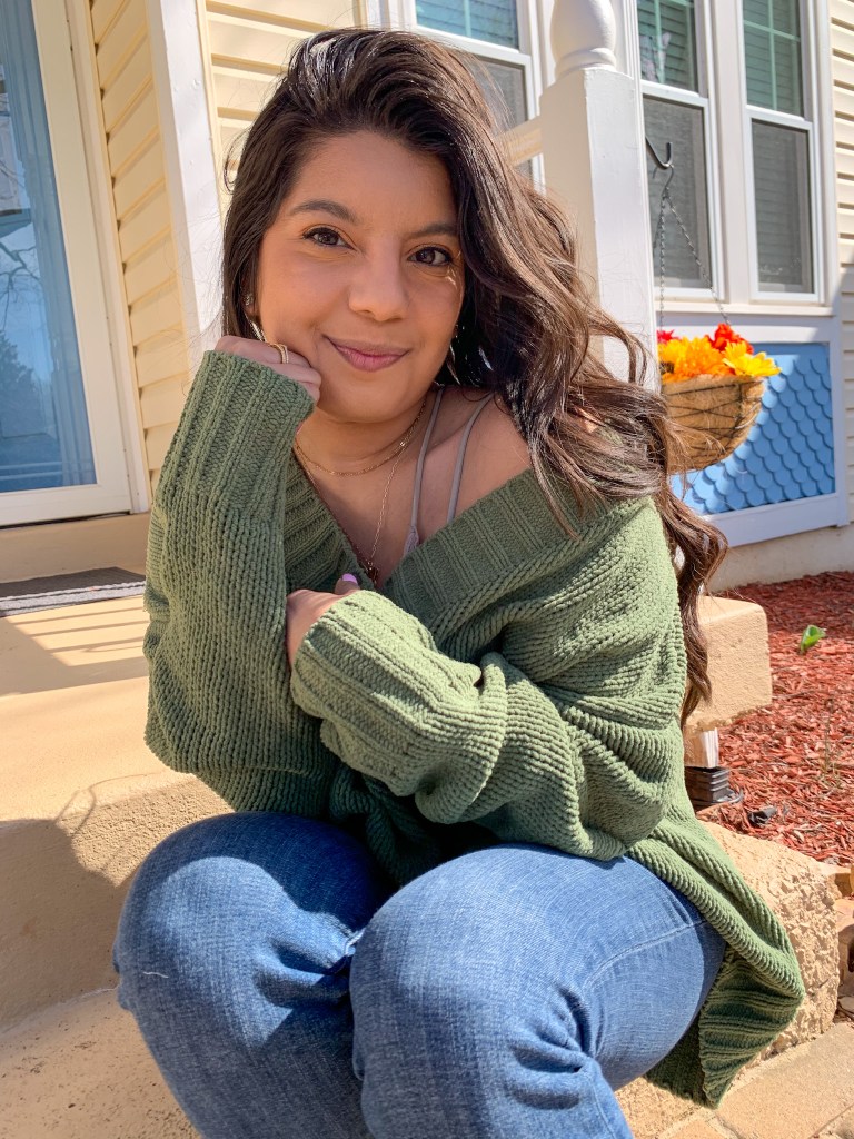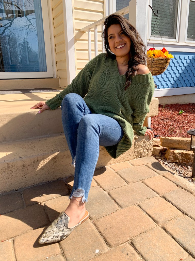 Sweater: Aerie, Size Small- I actually got this sweater just a few months ago in the fall and I absolutley love it. Other than its huge comfort factor, its lightweight and I like that its slightly oversized so I can easily pair a bralette with it. Thankfully, I bought this olive green version of the sweater and since its still windy and a bit chilly outside, this is what I will be wearing this St. Patrick’s Day. No pinches for me 🙅🏽♀️.