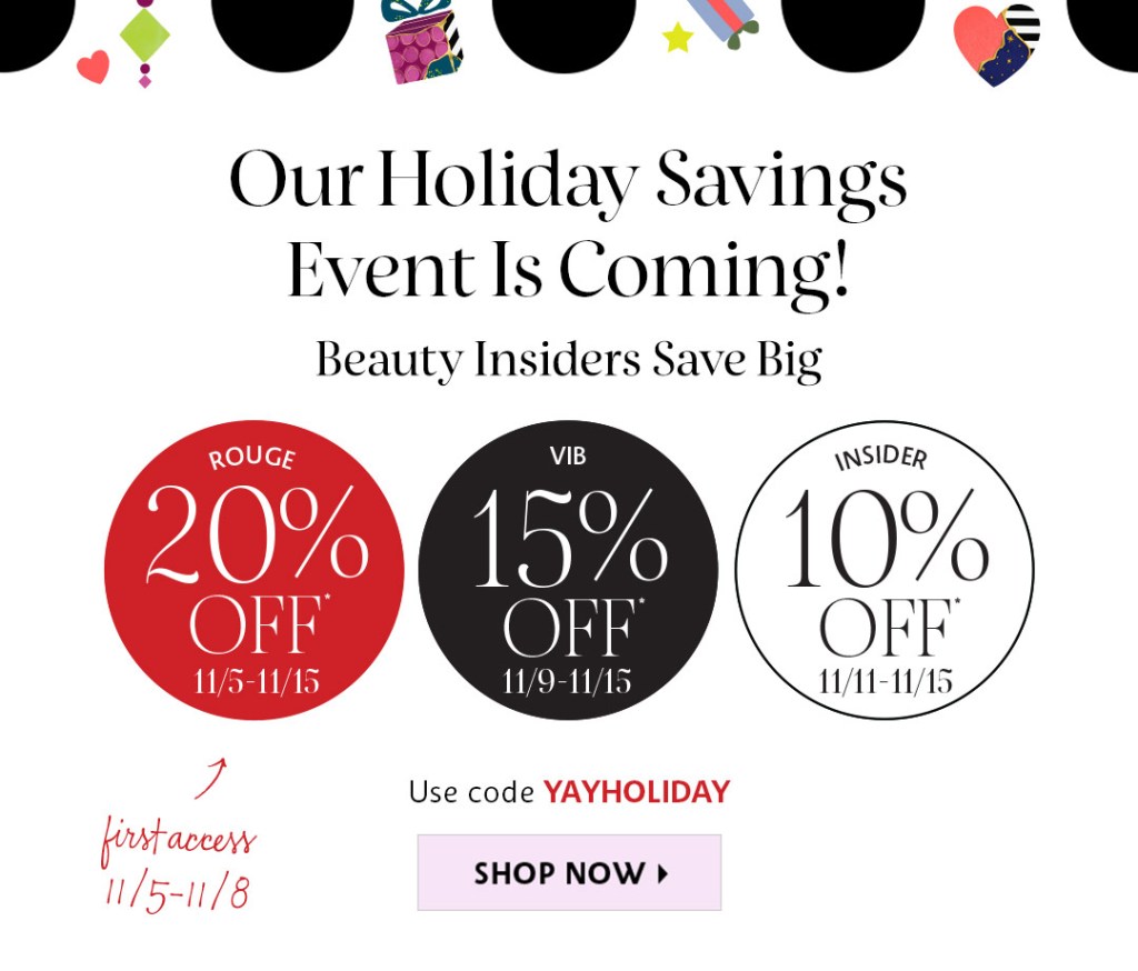 For those of you who have been following along with me since the beginning of my blog, this is the same spiel with all of the basic info that anyone needs to know in order to shop the event. First, you must have an account with Sephora. If you don’t have an account with Sephora, you can sign up for free here. If you are Rouge status, you will be able to shop first with early access with 20% off from November 1-November 11. If you are VIB status, you can start shopping with 15% off from November 5- November 11. If you are an Insider, you will be able to shop with 10% off from November 5- November 11. Make sure to use the code SAVINGS when you are checking out to receive your holiday savings! This discount code is multi-use and can be used in-store of course, as well. ✨