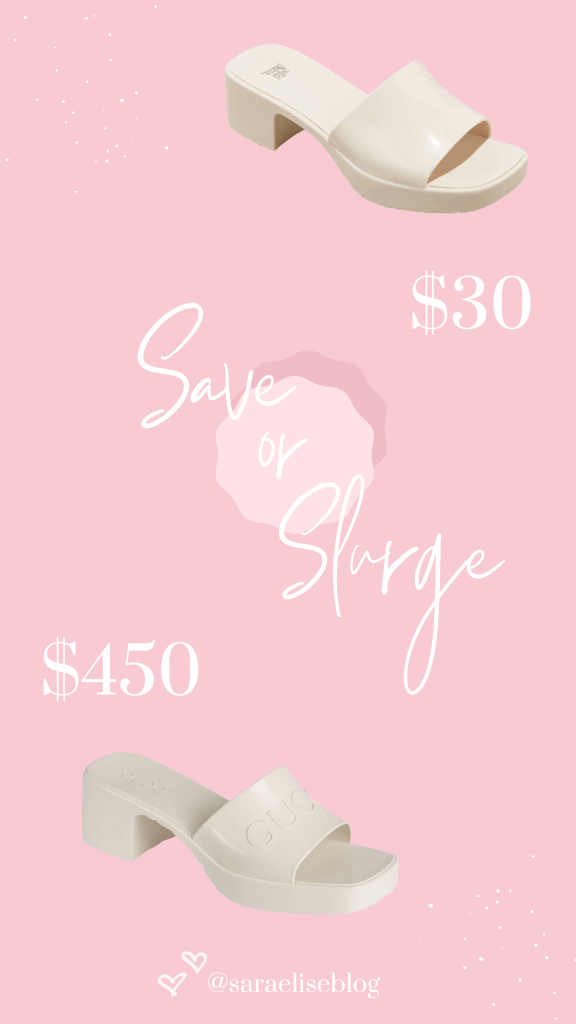 I am so excited to bring you this blog post as this has been one of my most requested blog topics over the past year. Last year, I had found some cute sandals while scrolling through my favourite sites and I realized I had seen something similar from other designer sites. I realized shortly after, that they were great lookalikes that I wanted to share with everyone. Since late February and early March are around the time that the spring and summer trends are released I have been busy spotting trends for the year. ✨While I don’t only shop trends but instead lean towards classic re-wear items, shoes definitely are the item that I look forward to seeing what’s trending. After looking through Target’s website, I realized that so many of the new arrivals, I had seen before but the most importantly at a better price point. The look-alike items are only a fraction of the price and still look like great quality. In this post I have compiled several versions for “save or splurge” and I’m excited to share them with you. 🛍